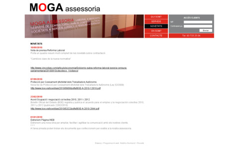 Web de l'assessoria Moga de Terrassa. Consta d'una part pública senzilla i d'una intranet per als clients, amb gestió de documents personalitzada.
